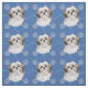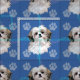 Este divertido y lindo estilo artístico Shih Tzu cabeza sonríe contra un fondo azul con huellas de pata y huellas en gris, lue y rosa. Diseño de Diane Blackman.