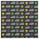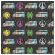 Tela hippie lindo con divertido patrón de autobús retro de camper de señales de paz y flores de bonito en colores hippy de neón fresco.