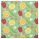 Tejido con un patrón de personajes lindos, sonrientes, frutales y vegetales sobre un fondo verde. Seleccione su tipo de tela y cuántos yardas necesita, agréguelos a su carrito y disfrute de sus productos de coser o de elaboración.