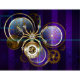 Araña de acero de oro y acero con relojes antiguos decorados con artes dorados sobre el fondo morado, rayado, texturado con lentes y engranajes de latón. Estilo Steampunk.
