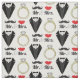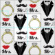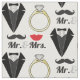 Tela temática boda adorable para celebrar la ceremonia nupcial de la hermosa pareja. El diseño presenta un moderno esmoquin negro, elegante banda de anillo de boda de oro y diamante, bigote de manillar negro y beso de labios rojos, junto con las palabras Mister y Misses, que celebran a la novia y al novio. Crear favores de boda personalizados usando este tema de fiesta nupcial.
