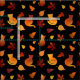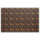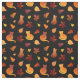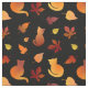 Un patrón de gatos de jengibre de silueta y hojas de otoño en naranja quemado, amarillo y rojo, sobre un fondo negro. Un gran diseño para una mamá de gatos que ama coser.