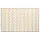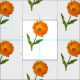 Las flores de caléndula están escalonadas en un patrón de "medio ladrillo" a través de la tela. Las gotas de lluvia muestran los pétalos de las flores naranjas. El tallo verde tiene dos hojas en lados alternativos