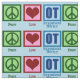 Un regalo lindo del navidad del terapeuta profesional que ofrece un signo de la paz verde, un corazón rojo, y un OT escrito en azul en un fondo azul. La terapia profesional es un empleo tan importante. Ayuda a adultos y a niños con terapia sensorial.