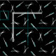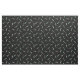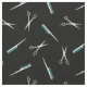 Tejido negro con un diseño moderno de tijeras y peines en blanco y verde azulado.