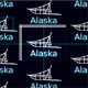 Una silueta blanca de un trineo de perros sobre un fondo de estrellas. "Alaska" aparece en azul y blanco brillantes.