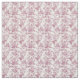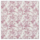 Patrón de tela vintage en rosa polvoriento, con rosas detallados, ramas frondosas y pájaros cantantes encaramados sobre un fondo blanco.