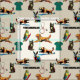 Patrón veterinario con perros, gatos, hurones, conejos, paracaídas, exfoliaciones médicas y estetoscopios.