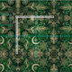 Patrón floral oro de moda y mágico dreamcatcher mandala, con una colección de plumas tribales, flores de mandala, flores geométricas, la luna, el sol y las estrellas, círculos, puntos, cuadrados, triángulos, zigzag chevron, formas geométricas, una mandala con ojo de protección, hecha con puntos dorados y plateados brillando purpurina destellos de imagen mística, sobre un bosque verde fondo de resplandor estrellado de gradiente verde esmeralda. Este diseño moderno, místico, tribal, moderno y de chicas bohemias, es perfecto para el uso diario, la decoración de casa, las celebraciones y la decoración temática de los días especiales.