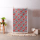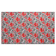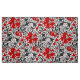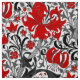 Tejido en una estampada floral de William Morris de lirios estilizados e irlandeses, realzado digitalmente y coloreado, en tonos grises/grises y negros, con flores rojas profundas, sobre un fondo blanco