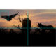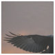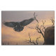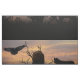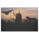 Dos lobos y un cuervo volador sobre un paisaje de silueta y una puesta de sol de nubes.