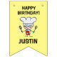 Tema de horneado infantil Fiesta de cumpleaños banderas. Diseño divertido para celebración infantil cerca de la cocina. Agregue su propio texto personalizado y colores de fondo. Funny pastelería cocinera dibujos de personalizado con delantal rojo sosteniendo un bigote y una cuchara de madera. Suministros fiestas personalizados para niños.