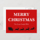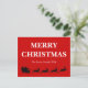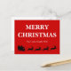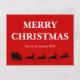 Esta postal con una silueta negra de Papá Noel que monta el reno cuatro en el trineo llenado de un bolso grande del regalo en fondo rojo brillante y el texto alegre blanco de las Felices Navidad y el apellido envía un mensaje cariñoso alegre dulce caliente del saludo de las vacaciones. Modifiqúela para requisitos particulares para hacerla especial.