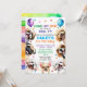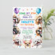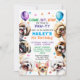 Invitación de perro a la fiesta de cumpleaños. 7 años (se puede cambiar la edad). Para niño o chica. Curada y feliz invitación al ilustracion de cachorro, sonriente, diseñada con confeti y globos rodeados de pequeñas razas populares de perros como shih tzu, pug, maltés, chihuahua, caniche y beagle. Todo el texto editable con el nombre, edad, hora del fiesta, dirección y RSVP del niño. Puede cambiar la imagen trasera por la foto de su hijo.