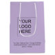 Eleva tus regalos corporativos con nuestra chic y ligera bolsa de compras morada, mostrando tu logotipo y texto personalizable.