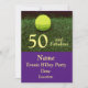 Tenis 50th y Fabuloso cumpleaños Invitación con pelota de tenis sobre césped verde con fondo morado
