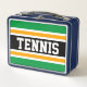 Este diseño deportivo presenta un audaz texto TENIS dentro de una amplia franja central de carreras horizontal negra resaltada con delgadas líneas blancas y doradas flotantes sobre rayas exteriores verde brillante. El texto se puede personalizar.