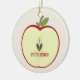 Un 3ro ornamento del profesor del grado que ofrece un ilustracion de la mitad de una manzana roja con dos semillas en la forma de un corazón. El texto me dice "(amor) tercer grado.