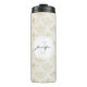 Botella de agua con un patrón elegante con abejas de burbujas de color dorado en un patrón repetido en un fondo de color crema.