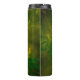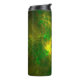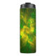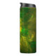 Composición digital abstracta térmica Tumbler, combinación original y sorprendente de colores y formas, que se emparejan para crear un tapiz exterrestre con flor abstracta. Las formas amarillas que dan un patrón en el diseño recuerdan a las flores naturales pequeñas y se mezclan con pequeños destellos de color verde claro, que también pueden parecer flores pequeñas. En general, la repetición algorítmica pero al mismo tiempo aleatoria de ciertos patrones, recuerda que el diseño es en realidad un fractal. La paleta de colores es bastante original y única, mezclando casi todos los tonos violeta con todos los tonos azules, la luz en el centro y el borde.