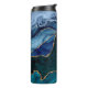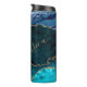 El hermoso tumbler termal personalizado presenta patrones lux agate y vena dorada en tonos pavo real de azul, verde, violeta y turquesa.