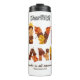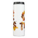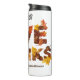 Este gráfico muestra las palabras "GIVE THANKS", que se explican a través de una variedad de hojas de otoño y bellotas en tonos cálidos de naranja, amarillo y marrón. Debajo del texto está la frase "Dé las gracias en todas las circunstancias" y la referencia bíblica "1 Tesalónica 5:18". El diseño tiene una estética a mano, de temática caótica.