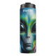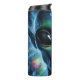 Este gráfico cautivador presenta una cabeza alienígena con ojos negros grandes y reflexivos y patrones intrincados y brillantes sobre su piel. Las salpicaduras de pintura vibrante rodean su forma, dando a entender la energía cósmica. Está situado en un entorno impresionante de nebulosas, estrellas y cuerpos celestes girando en azul, púrpura y verde, creando una escena etérea y misteriosa en el otro mundo.