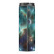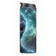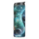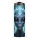Este impactante gráfico retrata una cabeza extraterrestre de color azul-gris con ojos grandes, oscuros y reflexivos y patrones de brillo intrincados. Una poderosa luz azul irradia desde su forma, y se expande a un agitado fondo cósmico de nebulosas, estrellas y planetas. Este diseño etéreo capta una profunda conexión con el vasto universo.