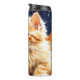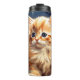 Tumbler termal con gatito naranja de estilo Art Nouveau de Alphonse Mucha. Este lindo gatito con ojos azules adorablemente te mira contra el telón de fondo de un cielo nocturno lleno de estrellas. ¡Un regalo maravilloso para los amantes del gato y de los coleccionistas Art Nouveau!