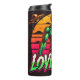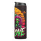 Un ilustracion vibrante tiene dos alienígenas de piel verde, uno más grande y otro más pequeño con el pelo rosado, parados juntos. Están colocadas contra una puesta de sol naranja y amarilla. El atrevido y angustiado texto "AMOR ES AMOR" domina el primer plano, transmitiendo un mensaje de afecto y aceptación cósmicos.