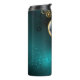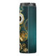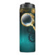 Una lupa antigua con mango dorado y lente convexa sobre el fondo verde con los engranajes dorados y un reloj antiguo. Estilo Steampunk.