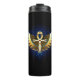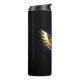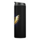 El tobillo egipcio dorado con alas estampadas y brillantes sobre un fondo negro. Símbolo mágico.