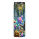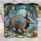 Este es un ilustracion caprichoso y vibrante de un armadillo con una concha de joyas y joyas multicolores, explorando una caverna mística. El armadillo está rodeado de cristales espumosos y rocas. El fondo está decorado con esculturas complejas y un pasaje resplandeciente que se adentra más profundamente en la mágica caverna. En la parte inferior derecha se ve un cofre del tesoro, lo que añade una sensación de fantasía y aventura.
