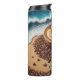 Este ilustracion único cuenta con una taza de café con un hermoso y detallado arte de café con leche, que descansa sobre un pequeño montón de granos de café. El lugar está situado en una playa de arena, con una divertida ola de olas en el océano en las cercanías. La composición combina el ambiente acogedor del café con el entorno tranquilo de la playa.