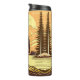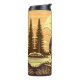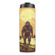 Retro Bigfoot o Sasquatch parados en una roca frente a los pinos y una puesta de sol en las montañas. Hecho en colores vintage naranja, amarillo y marrón.