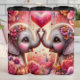This enchanting digital illustration features two adorable, wide-eyed baby elephants facing each other, their trunks raised to frame a glowing pink heart. The elephants are rendered with soft, realistic textures and expressive brown eyes, adorned with delicate pink and orange flowers behind their ears. The scene is set against a dreamlike background of shimmering golden light and floating hearts, with the foreground filled with a dense thicket of blooming pink and red roses. This seamless-style graphic is designed as a full-wrap for insulated tumblers, providing a high-impact, 360-degree visual experience. The warm, romantic color palette and whimsical character design make it an ideal gift for anniversaries, Valentine Day, or as a charming accessory for animal lovers.
