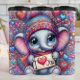 This enchanting digital illustration features an adorable, wide-eyed baby elephant dressed for cold weather in a vibrant, multi-colored knit beanie and matching scarf. The elephant holds a small sign that reads "I ❤️ You" in a charming handwritten style. The background is a dense, psychedelic explosion of swirling patterns, colorful hearts, and sparkling stars in shades of magenta, cyan, and gold. This seamless-style graphic is designed as a full-wrap for insulated tumblers, providing a high-impact, 360-degree visual experience. The playful character design and rich, kaleidoscopic color palette make it a perfect gift for Valentine Day, winter birthdays, or any animal lover who appreciates a whimsical and modern aesthetic.