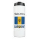Thermal tumbler presenta la Bandera Barbadiense con la palabra BARBADOS abajo en los colores de la bandera. Un lugar para tu nombre permite un aspecto personalizado. Si necesitas un regalo personalizado, simplemente agrega el nombre de otra persona. La bandera bajana es ultramarina y dorada con su tridente negro en el centro.