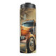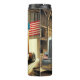 Esta imagen muestra un semi-camión de estilo vintage de color cobre estacionado en un rústico granero de madera. El camión tiene acentos cromados y un diseño clásico. Como telón de fondo, una bandera americana está colgada de forma prominente, parcialmente oscurecida por la puerta abierta del granero, que deja pasar la luz del día. La escena evoca un sentido de la Americana y el clásico patrimonio de la industria del transporte por carretera.