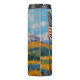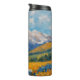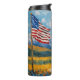 Este impresionante diseño utiliza un estilo de arte impresionista para retratar la bandera de los Estados Unidos y las montañas escarpadas.