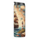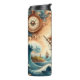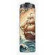 Este fantástico ilustracion cuenta con un barco pirata con velas de bronceado en un mar estilizado y ondulado. El fondo es un mapa detallado del tesoro con un gran rosa de brújula en la esquina superior izquierda. La escena incluye un faro de rayas rojas y blancas en una isla rocosa, un barco más pequeño a lo lejos y olas agitadas con elementos decorativos de estilo pergamino.