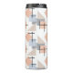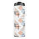 Esta botella térmica tiene un diseño Bauhaus de rectángulos repetidos, cuadrados, diamantes y triángulos en colores de playa de bronceado, gris, azul y naranja.