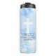 Este encantador tumbler presenta un inspirador verso de la biblia y una hermosa foto de un cielo azul suave junto con una cruz.