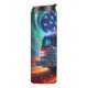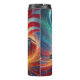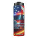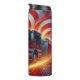 Este dramático gráfico muestra a un bombero con equipo completo, sosteniendo una manguera y parado en un campo de llamas. Detrás de ellos hay un camión de bomberos rojo y una gran bandera estadounidense parcialmente representada, creando una escena poderosa y patriótica que honra el heroísmo de los bomberos.