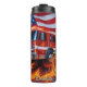 Esta dramática pintura digital muestra a un bombero con equipo completo, sosteniendo una manguera entre llamas que giran. Detrás del bombero hay un gran camión de bomberos rojo con luces intermitentes, colocado en el fondo de una bandera estadounidense ondeando y un cielo estrellado por la noche. La escena transmite la valentía y acción de los bomberos en un contexto patriótico.