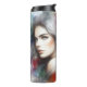 Una hermosa mujer con el cabello oscuro y los ojos llamativos se representa en un estilo de acuarela suave, su mirada dirigida hacia la izquierda. Un majestuoso lobo con cálidos ojos ámbar descansa muy cerca de ella, su conexión sugerida a través de la mezcla de colores y texturas. El fondo presenta lavados abstractos de azules vibrantes, violetas y naranjas, creando un retrato etéreo e íntimo.