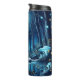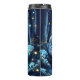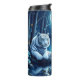 Este es un ilustracion místico y etéreo de un tigre blanco descansando en un bosque mágico por la noche. El tigre, con sus sorprendentes ojos azules, está tendido por un cuerpo quieto de agua, con su reflejo visible debajo. El bosque está compuesto por árboles altos, oscuros y sinuosos, iluminados por una gran luna llena de resplandor y luces de luciérnaga. Las setas azules y blancas brillan desde el suelo, lo que añade un ambiente mágico.