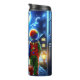 Temeroso tumbler termal de Halloween con arte aéreo que representa a un niño y chica con un vestido de payaso y bruja caminando por la casa para encontrarse con un monstruo aterrador al final de su acera.