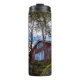 Pequeña casita de campo roja sobre un acantilado con un bello entorno. Fotografía.