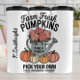 Este encantador ilustracion cuenta con una gran variedad de calabazas de diferentes colores que rodean una lata de agua llena de flores. El diseño está enmarcado por el texto "Calabazas frescas de granja" en la parte superior y "Escoja la suya" en la parte inferior. También dice 'Homegrown', que le da al arte un ambiente rústico y hogareño.